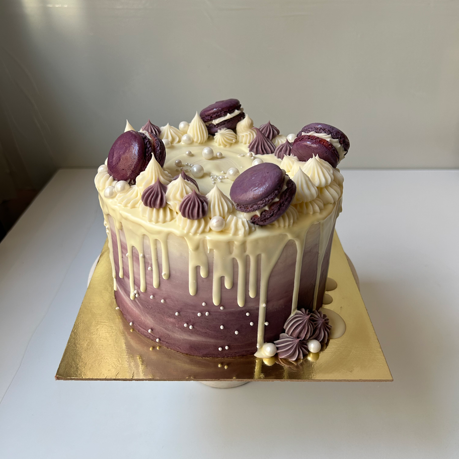 A stunning purple ombre drip cake adorned with vibrant edible purple macarons, delicate white pearls, and glossy drips for a chic, modern touch.
